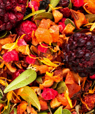 Состав: кусочки сушеного яблока, ежевика сублимированная, облепиха сублимированная, смородина сублимированная, кусочки сублимированной малины, календула, плоды черноплодной рябины, кожура шиповника, лист брусники, цукаты папайя, каркадэ. Содержит пищевые ароматические масла.