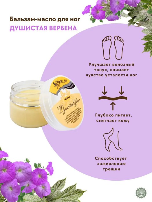 БАЛЬЗАМ-МАСЛО для ног "ДУШИСТАЯ ВЕРБЕНА" - это нежнейшая композиция специально подобранных натуральных масел, экстрактов, эфирных масел, витаминов и других ценных ингредиентов.