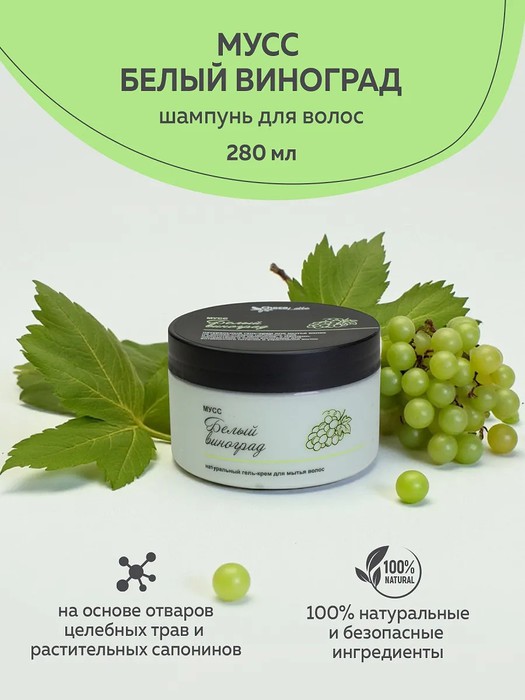 Натуральный гель-крем для мытья волос МУСС БЕЛЫЙ ВИНОГРАД создан по уникальной технологии на основе целебных трав и растительных сапонинов, с маслами, с соком и экстрактом винограда для витаминного питания. укрепления и антиоксидантной защиты волос.