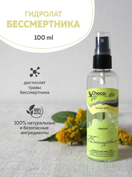 ** Описание: Вода получаемая в процессе водно паровой дистилляции травы бессмертника. Не содержит искусственных добавок, красителей и консервантов.