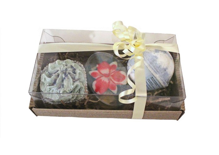 Ароматная пена для ванны в форме аппетитного пирожного, бурлящий шарик для принятия ванны и нежное мыло с оригинальным внутренним дизайном элегантно упакованы коробочку из гофрокартона, декорированы лентой.