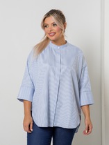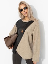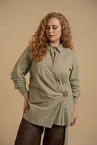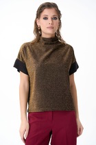Блузка из вискозного трикотажного полотна джерси, свободного кроя. Втачной короткий рукав. Отложной воротник со стойкой, спереди цельнокроеная планка на пуговицах. Боковые разрезы, нашивка металл.
