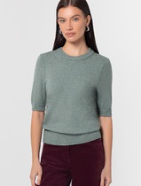 Джемпер без рукавов из фактурного трикотажного полотна джерси, среднее плечо. V-образный вырез грловины,по спинке узкая перемычка из окантовки. Перед и спинка двойные, спереди нашивка дерево.