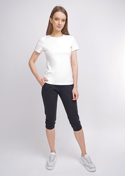 Бриджи женские из плотного эластичного трикотажного полотна. Отрезной пояс. Карманы в бочках. По низу манжеты.