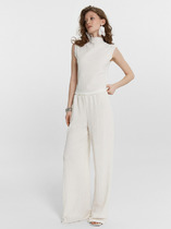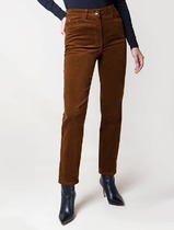 Брюки прямые из плотного трикотажного полотна. По талии притачной пояс с застежкой на пуговицу, по спинке пояс на резинке. По переду карманы в листочку с декоративной тесьмой.