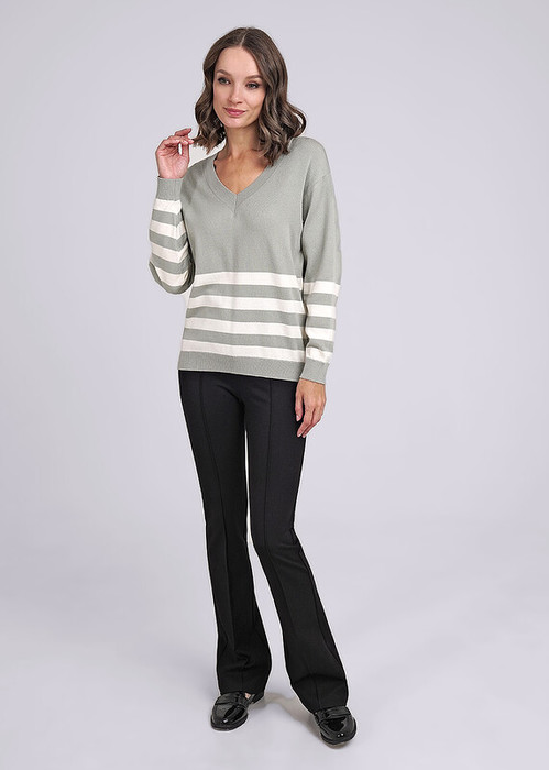 Брюки женские из плотного джерси расклешенного силуэта, спереди рельефные швы, по поясу внутренная резинка.