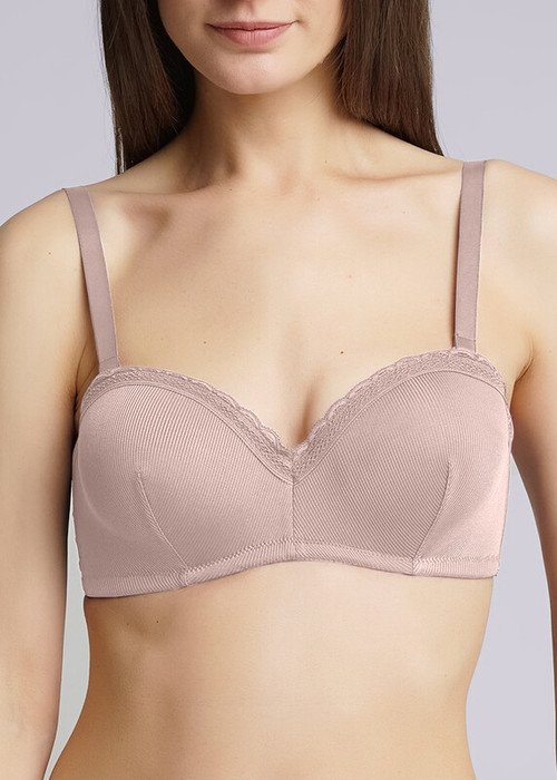 Бюстгалтер с формованной чашкой без push-up, со съемными бретелями и силиконовой лентой с внутренней стороны пояса бюстгалтера. По верху чашки модель декорирвана кружевом.