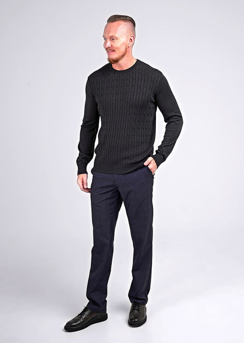 Джемпер мужской из смесовой хлопковой пряжи с длинным рукавом и круглой горловиной. По переду фатурное переплетение - косы. Данный джемпер можно комбинировать с брюками или джинсами. Прекрасно подойдёт для похода на работу.
