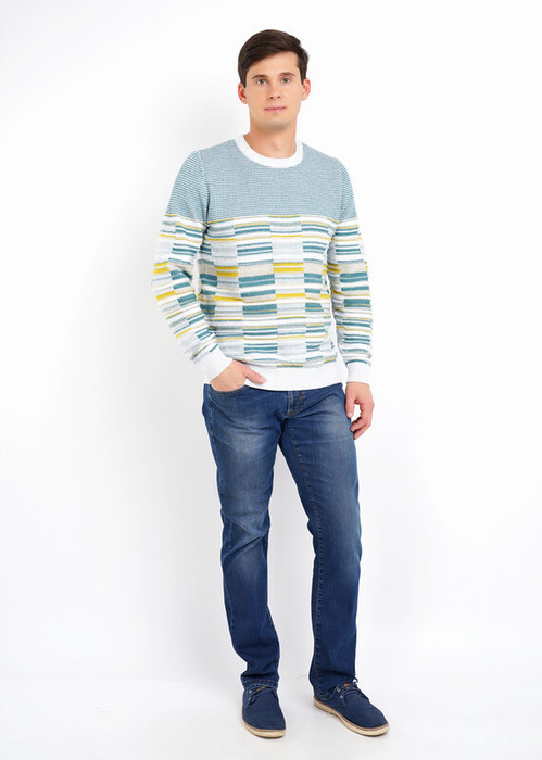 Мужской джемпер из смесовой пряжи с круглым вырезом горловины и длинным рукавом. По низу рукава и изделия комфортная эластичная резинка. Модель интересна за счет кокетки и комбинации плашечной цветной вязки, а так же дополнена металлофурнитурой.