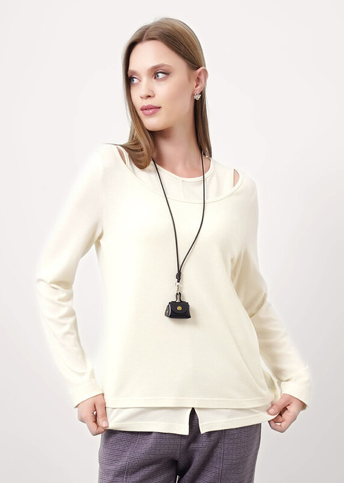 Джемпер из трикотажного полотна вискоза вязанная. Округлая горловина с окантовкой. Втачной длинный рукав. Перед двойной (нижний слой со средним швом и разрезом внизу).