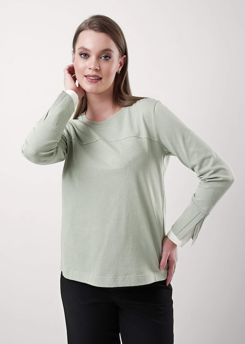 Джемпер прямого силуэта из плотного хлопкового трикотажного полотна с втачным длинным рукавом. Округлая горловина с обтачкой. По переду горизонтальный рез. По низу рукава шлица с внутренней контрастной манжетой.