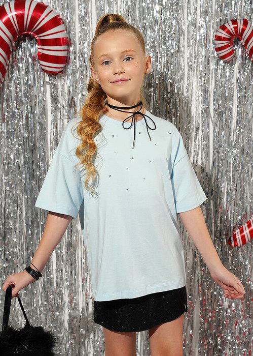 Стань настоящей fashion-иконой! Стильная футболка с отделкой из страз попадет прямо в сердце. Модель выполнена хлопка с эластаном. Приятный материал и оверсайз объем сделает эту вещь любимой. Прекрасно подойдет для встреч с друзьями или праздника.