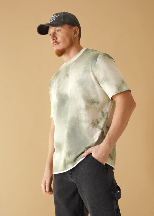 Стильная мужская футболка увеличенного объема. Выполнено из трикотажного полотна в хаотичную набивку. Изделие с круглым вырезом горловины и коротким рукавом. Модель дополняет принт и имиджевая фурнитура. Хорошо сочетается с джинсами.