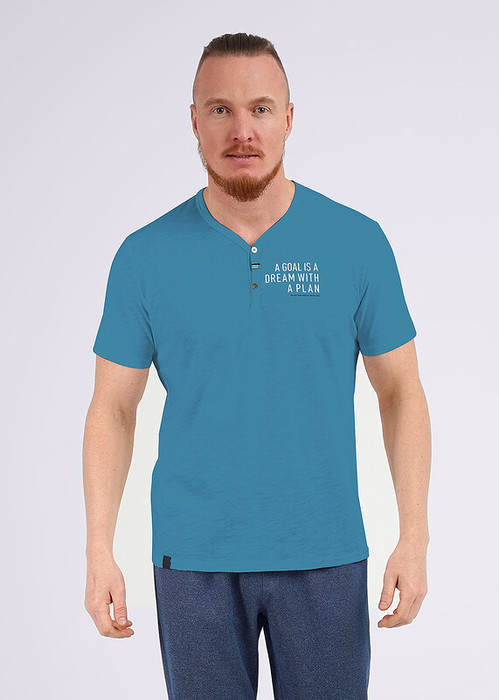 Футболка мужская из хлопкового полотна (флам) с декоративной планкой и пуговицами, дополнена лаконичным принтом. Отличный вариант на каждый день.