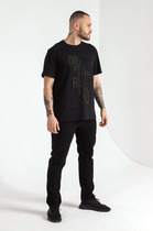 Футболка мужская с V-образным вырезом горловины и коротким втачным рукавом из фактурного полотна ""флам"". Данная модель дополнена контрастными отделочными строчками по боковым швам и шрифтовыми принтами. Можно сочетать с брюками или шортами.