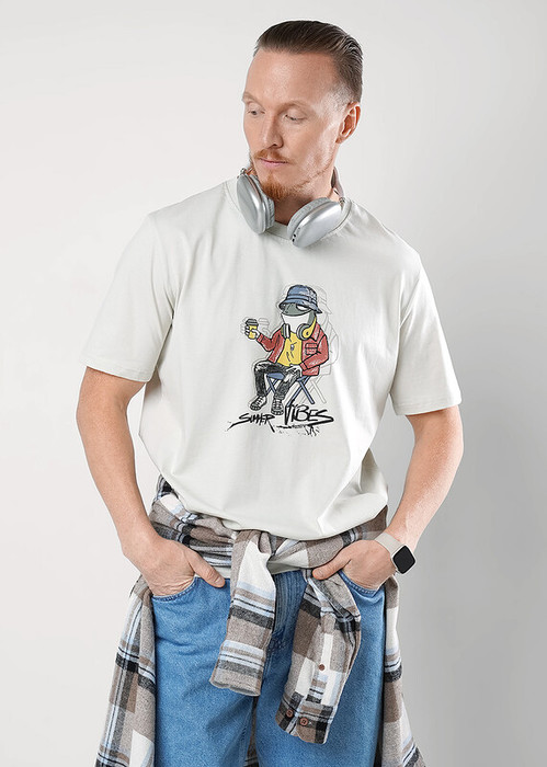 Футболка свободного кроя с круглым вырезом горловины и коротким рукавом. Модель выполнена из трикотажного хлопкового полотна. Изделие дополнено дизайнерским принтом и имиджевой фурнитурой. Универсальная вещь мужского гардероба на каждый день.
