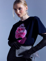 Джемпер из хлопкового трикотажного полотна. Короткий спущенный рукав. Круглый вырез горловины обработан рибаной. По спинке средний шов и пояс на резинке. По переду термонаклейка.