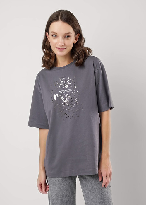 Футболка оверсайз свободного кроя из хлопкового трикотажного полотна. Слегка спущенный короткий рукав. Округлая горловина с обтачкой из рибаны. По спинке средний шов. Спереди принт с фольгой.