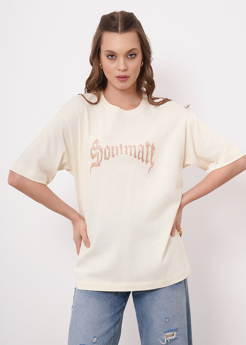 Футболка оверсайз из хлопкового трикотажного полотна. Короткий спущенный рукав. Округлая горловина с обтачкой из рибаны. По спинке средний шов. По переду термостразы.
