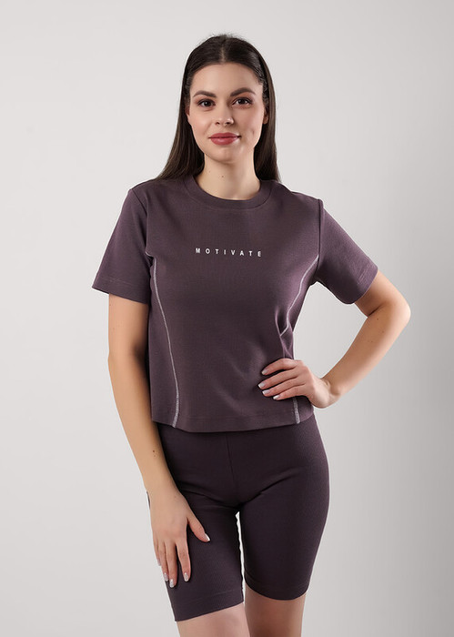 Футболка для дома и отдыха из трикотажного полотна рибана с эластаном. Укороченная, объемного силуэта. Короткий втачной рукав. Округлая горловина с широкой обтачкой. На детали переда вертикальные резы с контрастным застилом, принт.