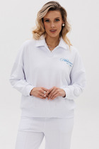 Джемпер спортивный свободного силуэта из трикотажного полотна футер с начесом, с капюшоном на подкладе. Длинный рукав со спущенной линией плеча. По низу рукава и изделия манжеты. Спереди вверху принт, внизу карман кенгуру.