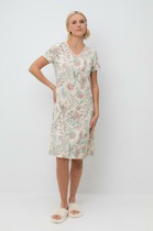 Комплект домашний, состоящий из футболки и брюк. Футболка с круглым вырезом горловины, коротким рукавом, нагрудным карманом и функциональной планкой на две пуговицы. Брюки из трикотажного полотна на эластичном поясе с боковыми карманами и шнуром.