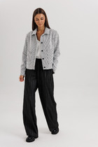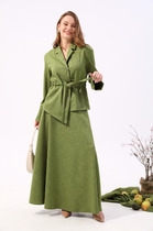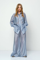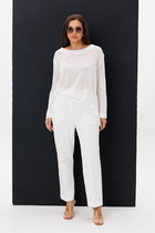 Комплект из текстильного полотна штапель-креп. Блузка свободного кроя. Втачной рукав. Отложной воротник спереди планка на пуговицах,накладной карман.Боковые разрезы.Брюки широкие. По талии пояс на резинке,с завязками. Боковые карманы в отрезном бочке.