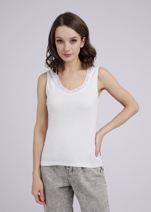 Базовая, малообъемная майка из трикотажного, эластичного полотна. V-образная горловина обработана кружевом. Широкая бретель. Производство Узбекистан.
