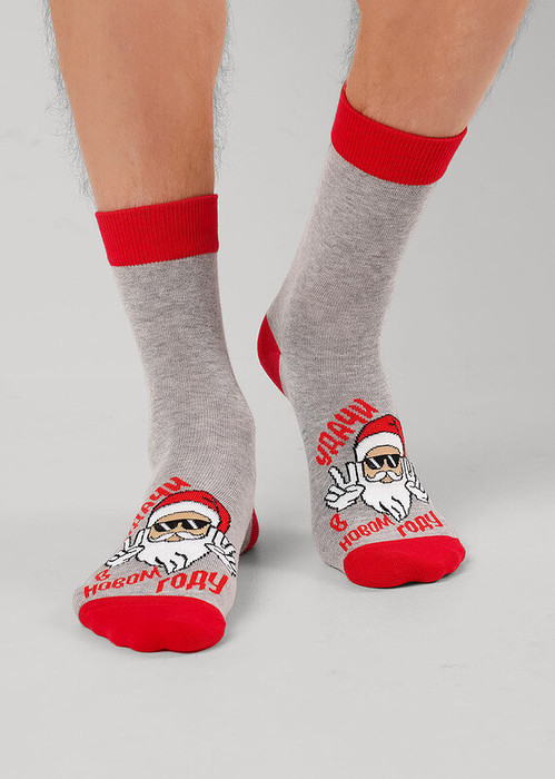 носки мужские с выделенным мыском и пяткой и бортом , с рисунком лицо деда мороза и надписью удачи в новом году
