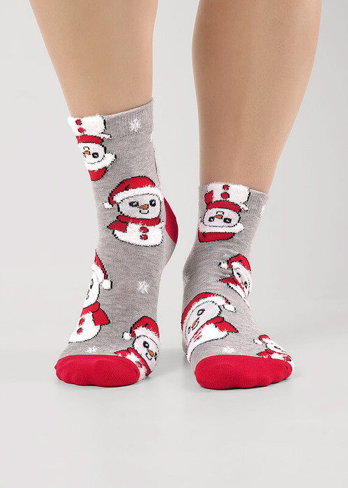 Носки женские с рисунком снеговики, тело снеговика и отворот колпака выполнен из пряжи травка