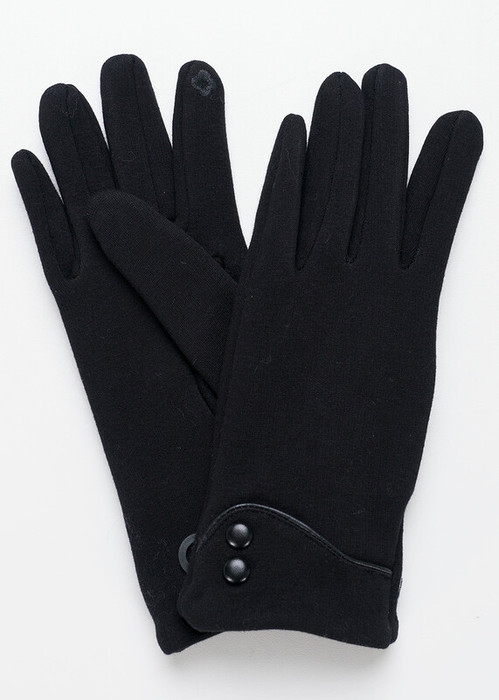 Женские перчатки из трикотажного полотна имитирующего внутри искусственный мех, декорированы кожанной окантовкой и пуговицами, на большом и указательном пальцах вышивка ""сенсорными"" нитками, размер 18.