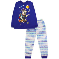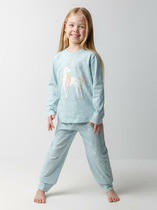 Комплект хлопковой пижамы из футболки и брюк. Футболка свободного кроя со спущенным плечом, спереди украшенная милым тематическим принтом. Брюки среднего объема, эластичный пояс обеспечит комфорт и идеальную посадку. По низу брюк эластичные манжеты.