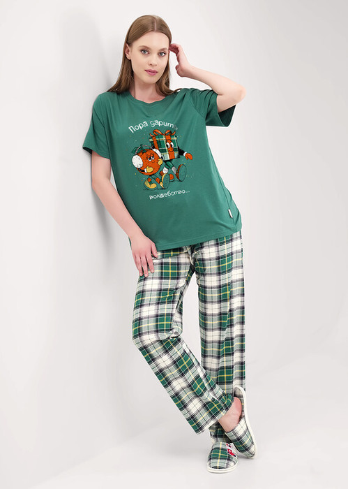 Пижама из хлопкового трикотажного полотна. Футболка прямого кроя. Короткий втачной рукав. Округлая горловина с обтачкой. Спереди принт. В боковом шве вшивка. Брюки из трикотажного полотна с карбоном прямые, пояс на внутренней резинке с киперной лентой.