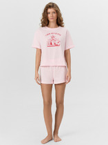 Набор одежды из трикотажного полотна.Футболка с коротким втачным рукавом,отворотом и закрепкой. По горловине обтачка.Спереди принт, нашивка в боковом шве. Брюки с поясом на резинке и киперной лентой. Боковые карманы с отрезным бочком. Внизу брюк резинка.