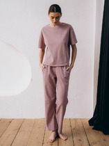 Набор одежды из трикотажного полотна.Футболка прямого кроя. Короткий втачной рукав с отворотом и закрепкой. По горловине обтачка.Спереди принт с помпоном, вшивка в боковом шве.Брюки с поясом на резинке.Боковые карманы с отрезным бочком.Внизу брюк манжет.