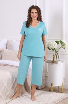 Комплект для дома из хлопкового трикотажного полотна кашкорсе. Футболка с коротким втачным рукавом и круглой горловиной. По низу перламутровая нашивка. Брюки с цельнокроеным поясом на внутренней резинке.