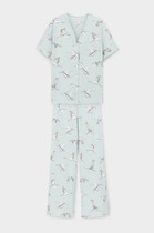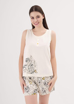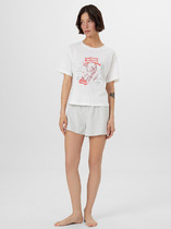 Набор одежды для дома и отдыха из трикотажного полотна. Футболка прямого кроя, горловина с обтачкой. Короткий целькроенный рукав. Спереди накладной карман с принтом вспенка. Шорты с поясом на резинке и киперной лентой. Боковые карманы с отрезным бочком.