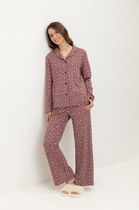 Набор одежды из хлопкового трикотажного полотна с модалом. Футболка прямого кроя. Короткий спущенный рукав. По горловине обтачка с кружевом. Спереди нашивка, сзади принт. Брюки прямые с поясом на внутренней резинке. По боковым швам узкое кружево, 2 ряда.