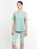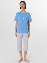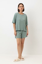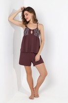Пижама для дома из хлопкового трикотажного полотна. Майка прямого силуэта, на узких бретелях. По горловине и пройме окантовка. Короткие шорты свободного кроя, цельнокроеный пояс на внутренней резинке.