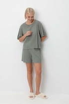 Пижама для дома и отдыха из трикотажного полотна с добавлением эластана. Майка умеренного объема. Узкая бретель, округлая горловина. По горловине и пройме окантовка. Короткие шорты свободного кроя, пояс на внутренней резинке. Спереди бант.