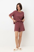 Пижама для дома из трикотажного полотна кашкорсе лапша. Майка укороченная. Узкая бретель. Округлый вырез горловины. По горловине и пройме окантовка.Спереди нашивка. По низу внутренняя резинка. Шорты прямого кроя, пояс на внутренней резинке, нашивка.