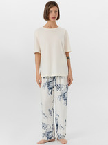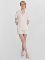 Пижама для дома из хлопкового трикотажного полотна. Майка на узких бретелях. По горловине переда обтачка с кружевом, бант.Отрезной лиф со сборкой. По пройме окантовка. По низу изделия мелкий оверлок. Короткие шорты с поясом на резинке. По низу шорт рюша.