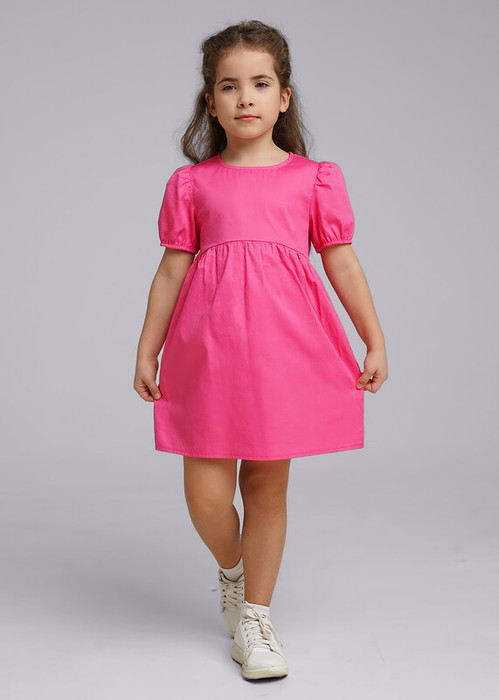 Яркое платье для самых очаровательных девочек! Пышный рукав и юбка придают образу воздушность и легкость. Расклешеный силуэт не сковывает движения. Спереди модель дополнена милым декором. Материал пропускает воздух - прекрасно для знойных летних дней.