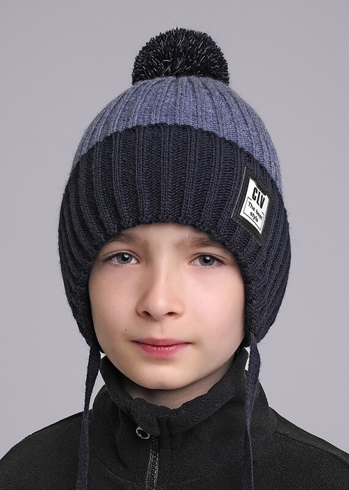 Детская шапка с отворотом на завязках. Декорирована стильной нашивкой в височной зоне и ниточным помпоном. Утепление флисом и синтепоном по всей голове. Идеально подойдёт для холодной зимы.