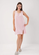 Сорочка ночная из хлопкового трикотажного полотна с добавлением модала, слегка расклешенная книзу. Узкая бретель с регулировкой длины. V-образный вырез горловины с внутренней обтачкой.