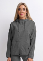 Джемпер комбинированный из эластичного футера 2х нитки. Длиный рукав со спущенной линией плеча. Воротник стойка с застежкой на молнию. По переду и спинке отрезные кокетки. Низ изделия и рукавов на манжете с резинкой. Принт на правом рукаве.
