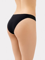 Трусы бикини женские из эластичного хлопкового полотна. По бокам вставки из кружева. Обработка краев по талии и ноге - ажурная резинка с фестоном, точечный зигзаг. По переду атласный бант.