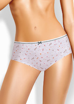 Модель бразилиана на хлопковом полотне с добавлением эластана. На детали переда -  симметричные кружевные вставки, переходящие на деталь спинки. По талии - обработка резинкой. Завершает дизайн небольшой бант на детали переда.