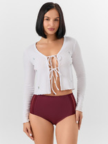 Трусы стринги комфортной посадки из однотонного трикотажа. По ножке и талии обработка кружевной резинкой. Спереди по центру небольшой бант и симметрично по бокам настрочено кружево.