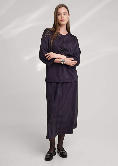 Юбка миди из поливискозного трикотажного полотна джерси. Притачной пояс со шлевками и внутренней резинкой. Спереди две односторонние складки. Сзади средний шов.